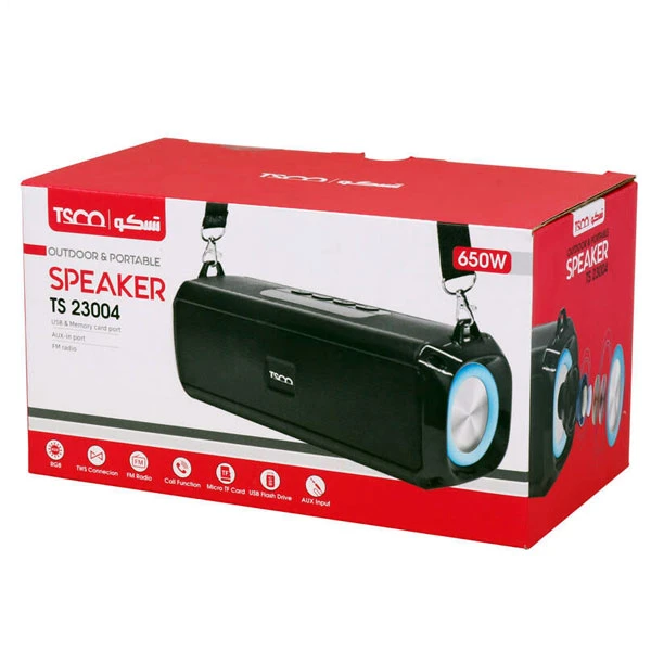از نظر امکانات، TS 23004 مجهز به درگاههای USB Flash، Micro SD، AUX و همچنین رادیو FM و قابلیت پاسخگویی به تماسهای ورودی است. باتری لیتیومی 1200 میلیآمپری آن در مدت 3 ساعت شارژ کامل میشود و توان خروجی 10 وات را ارائه میدهد که برای فضاهای کوچک و متوسط کاملاً مناسب است. طراحی مشکی، بند آویز، و نمایشگر LED برای وضعیت شارژ، این اسپیکر را به گزینهای کاربردی و خوشساخت تبدیل کرده است.