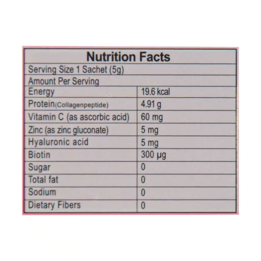 در ترکیبات این محصول کلاژن، ویتامین C، هیالورونیک اسید، زینک و بیوتین وجود دارد که همگی برای سلامت پوست و مو موثر است. در ادامه به کارایی هر یک از اجزای این پودر میپردازیم: